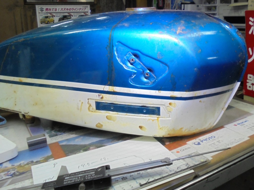 まずタンクは内外ともに錆びていたので内部の錆を完全に除去、その後内部コーティングで綺麗にし内部が終わってから塗装面を再塗装しタンクを再生しました。サイドカバーも同じく再塗装。