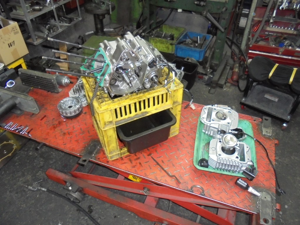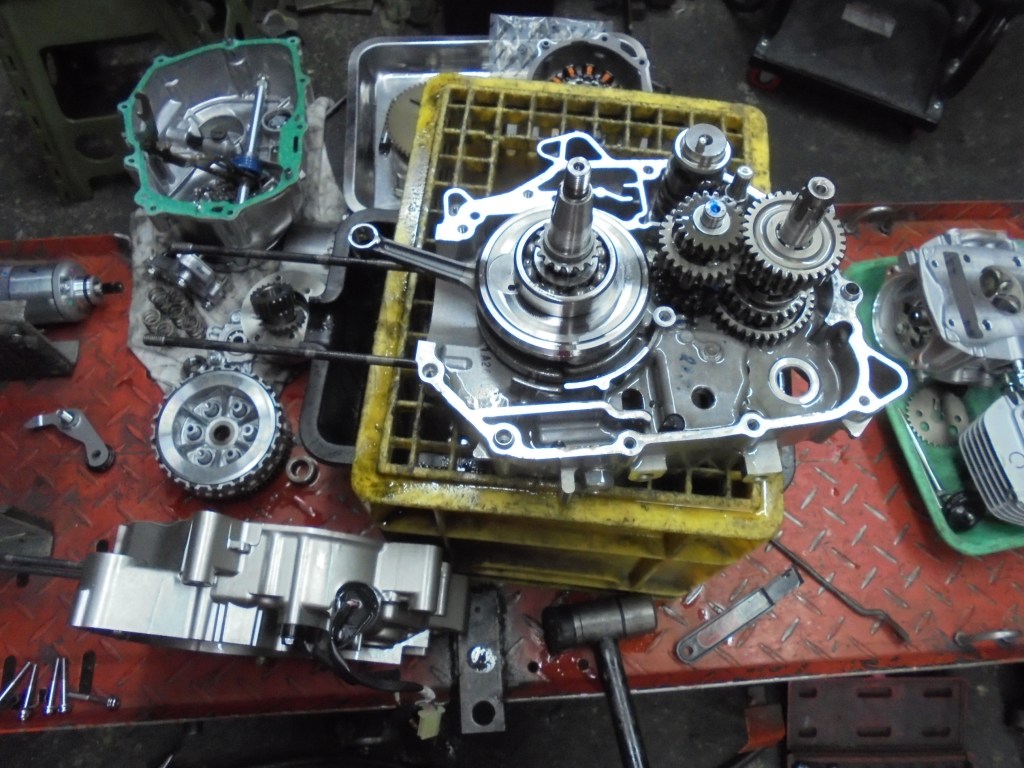 ヘッドとシリンダーを外したらエンジンを割りミッションを交換しました