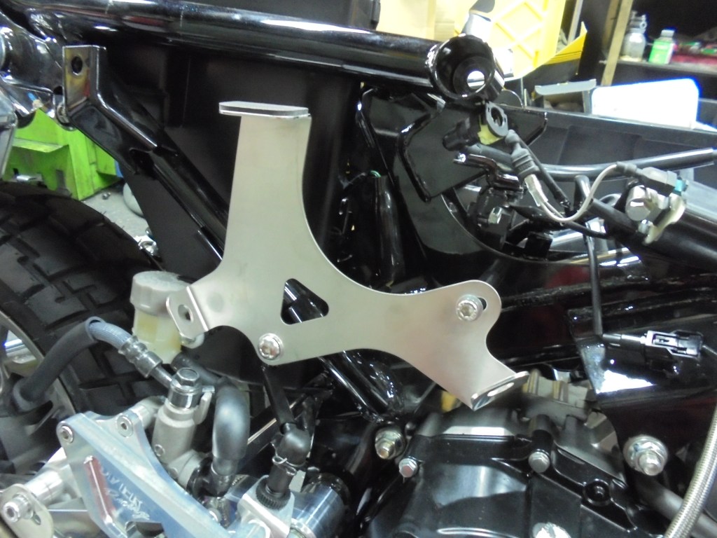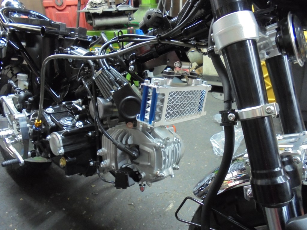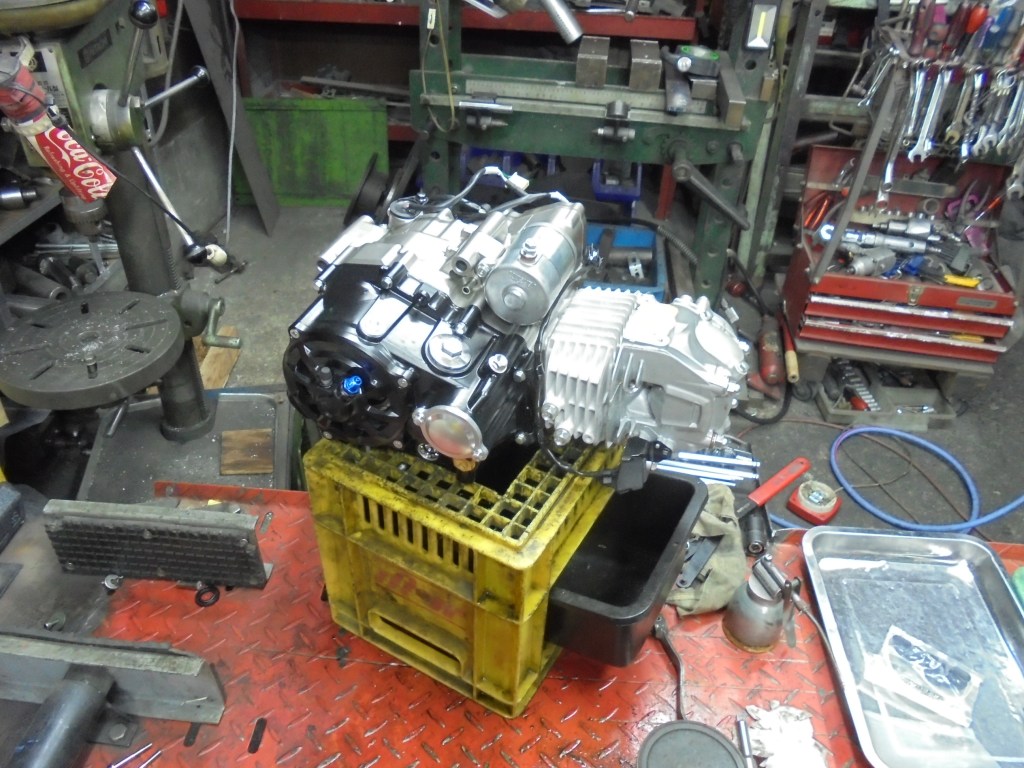 組上がったエンジンを車両に載せオイルクーラーとスロットルボディエアクリーナーを取り付けていきます