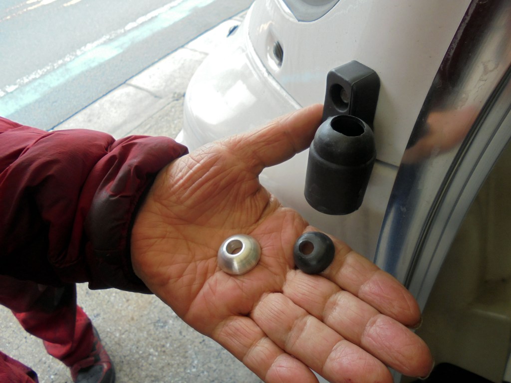 純正のノーマルミラ-のままですとミラーの硬さを調整するナットを締め込んだ時プラスチックの半球ワッシャーがトルクに耐えられず破損したり走行中の振動でヒビが入りミラーごと脱落してしまう事がございます。